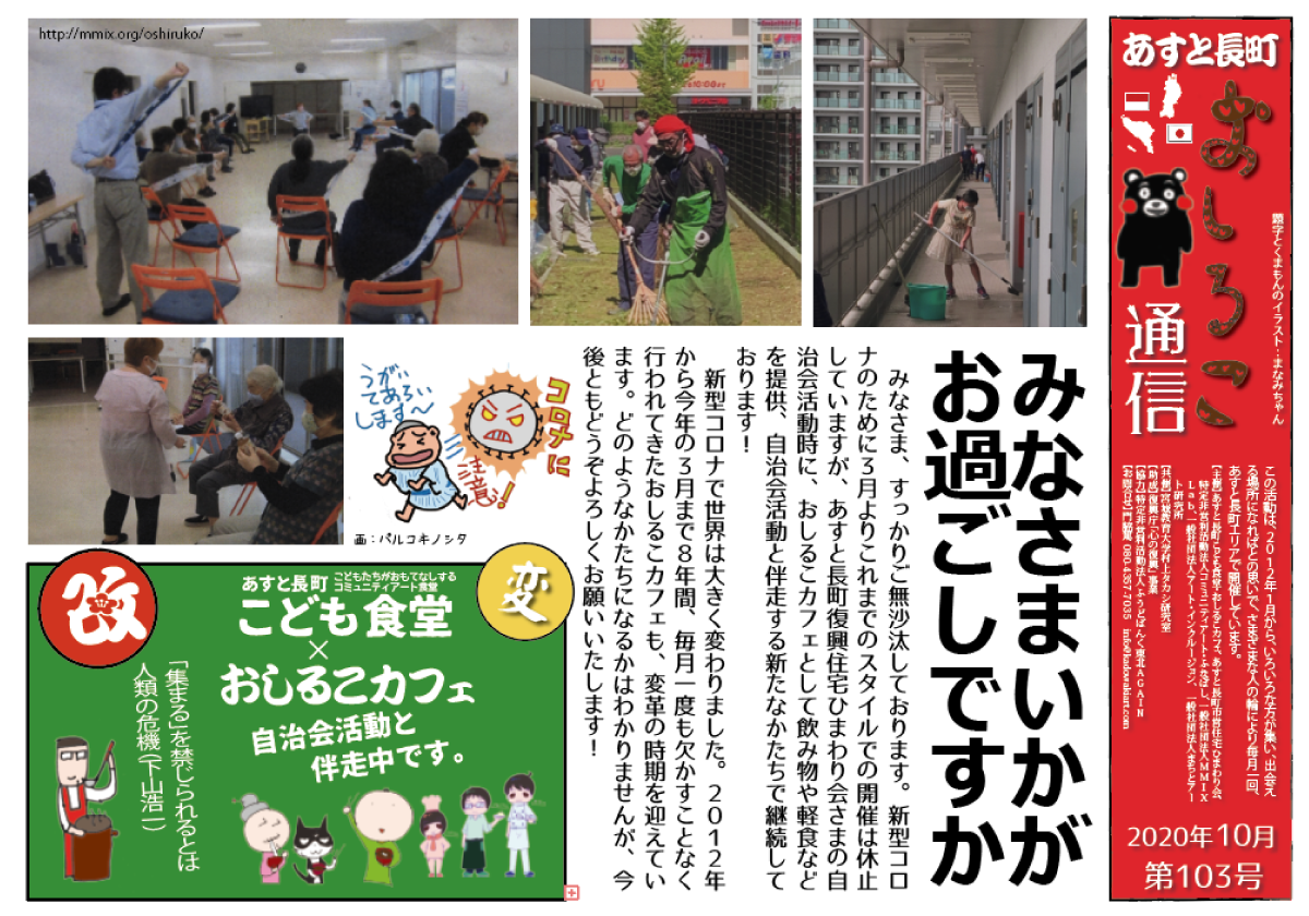 5月より月2回程度、草刈り、カラオケ大会、健康体操、清掃活動などあすと長町復興住宅ひまわり会さまの自治会活動に「おしるこカフェ」として飲み物や軽食などをご提供するかたちで実施しています。毎回、20-30人程度にご参加いただいています。