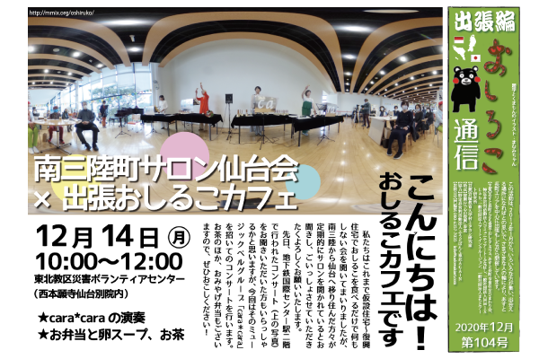 南三陸から仙台へ移り住んだみなさまが東北教区災害ボランティアセンター(西本願寺仙台別院内)で定期的に集まりを持っている「南三陸町サロン仙台会」さまへ、コミュニティ再生の一助になればとコンサートのお誘いをしたり、お茶やお弁当をお届けしたりしています。