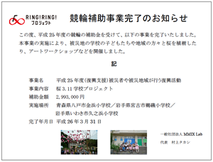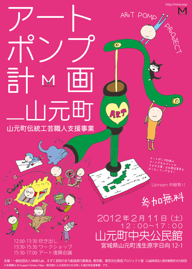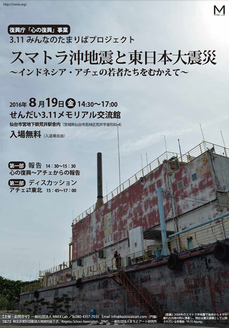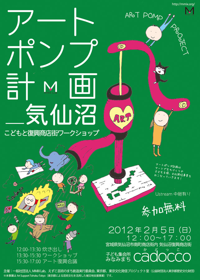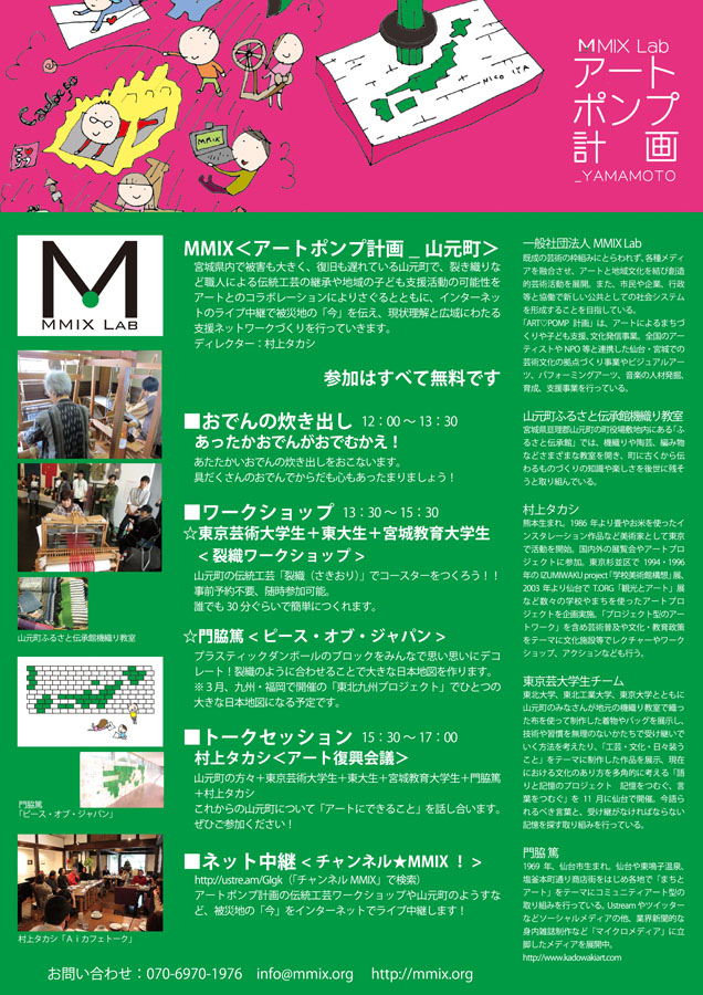 MMIX Labは公益性のある芸術文化活動を行う仙台宮城の社団法人としてまちづくり、子ども支援、福祉、環境、就労支援等のNPOや自治体などとも連携した復興支援活動を行います。
