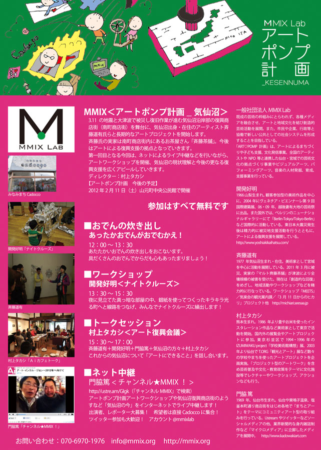 (出展作家)村上タカシ、開発好明、パルコキノシタ、カセトラプロジェクト、コトのアート研究所、桜3.11プロジェクト3.11メモリアルプロジェクト